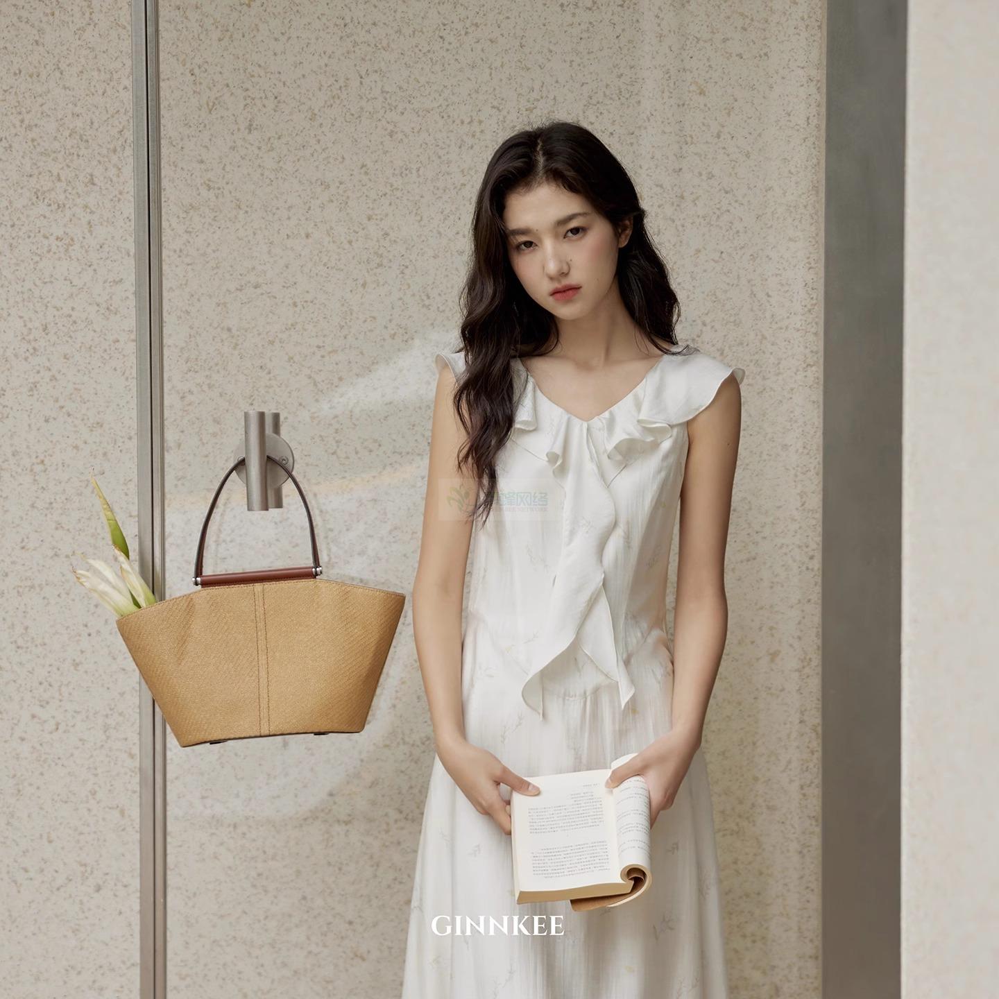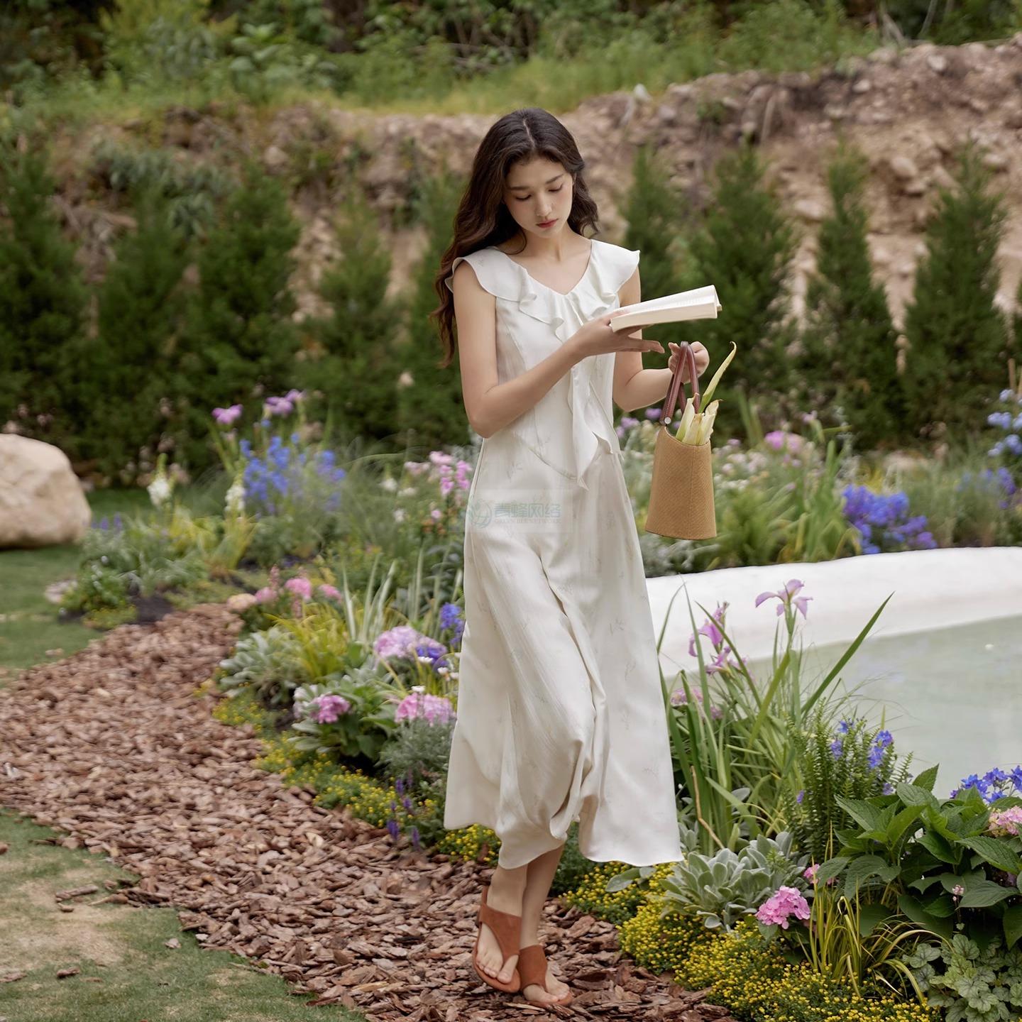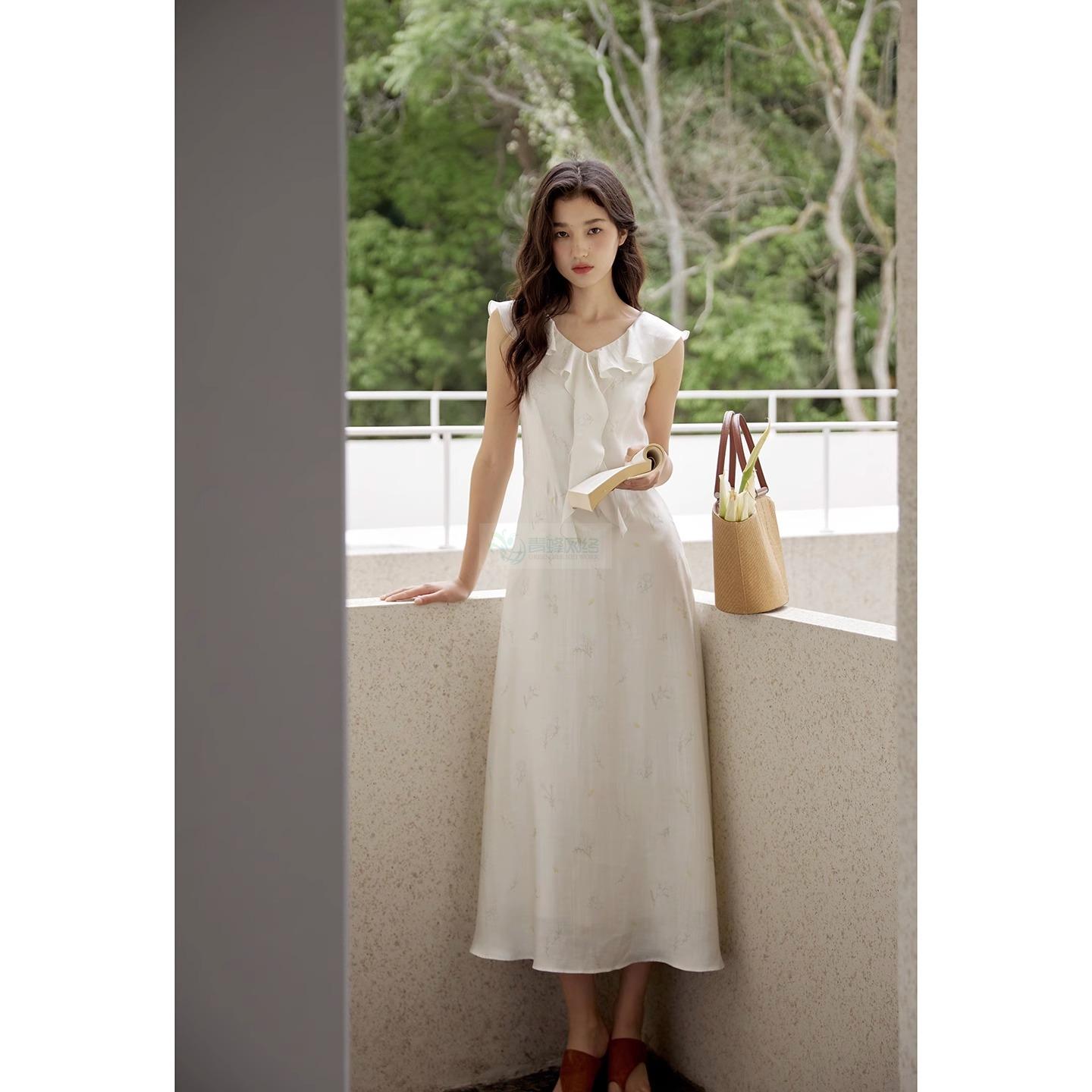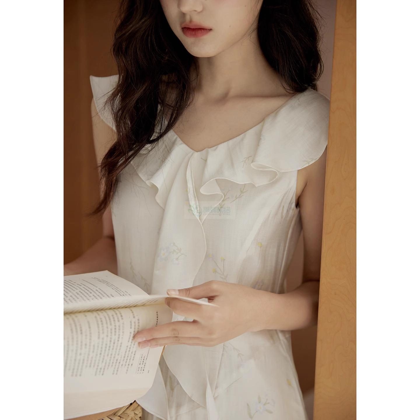 法式优雅天丝醋酸碎花裙荷叶边V领无袖连衣裙女夏白色长裙