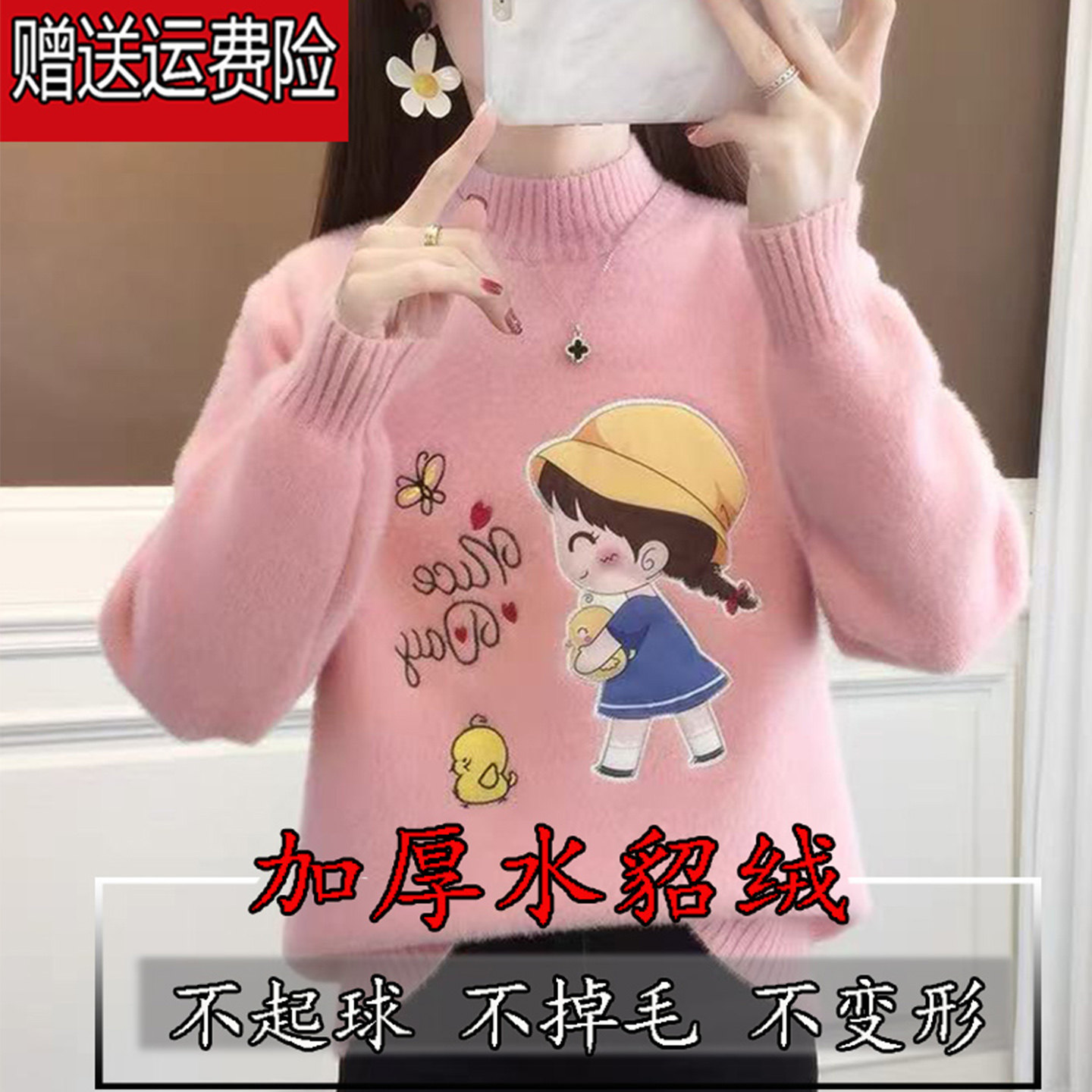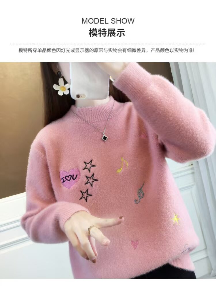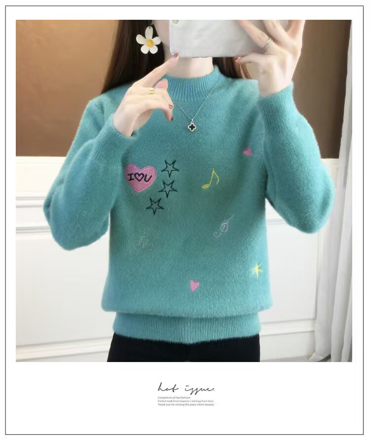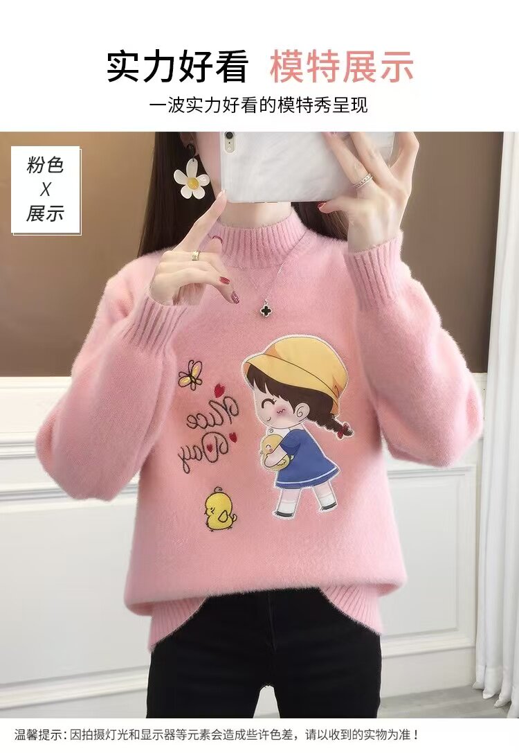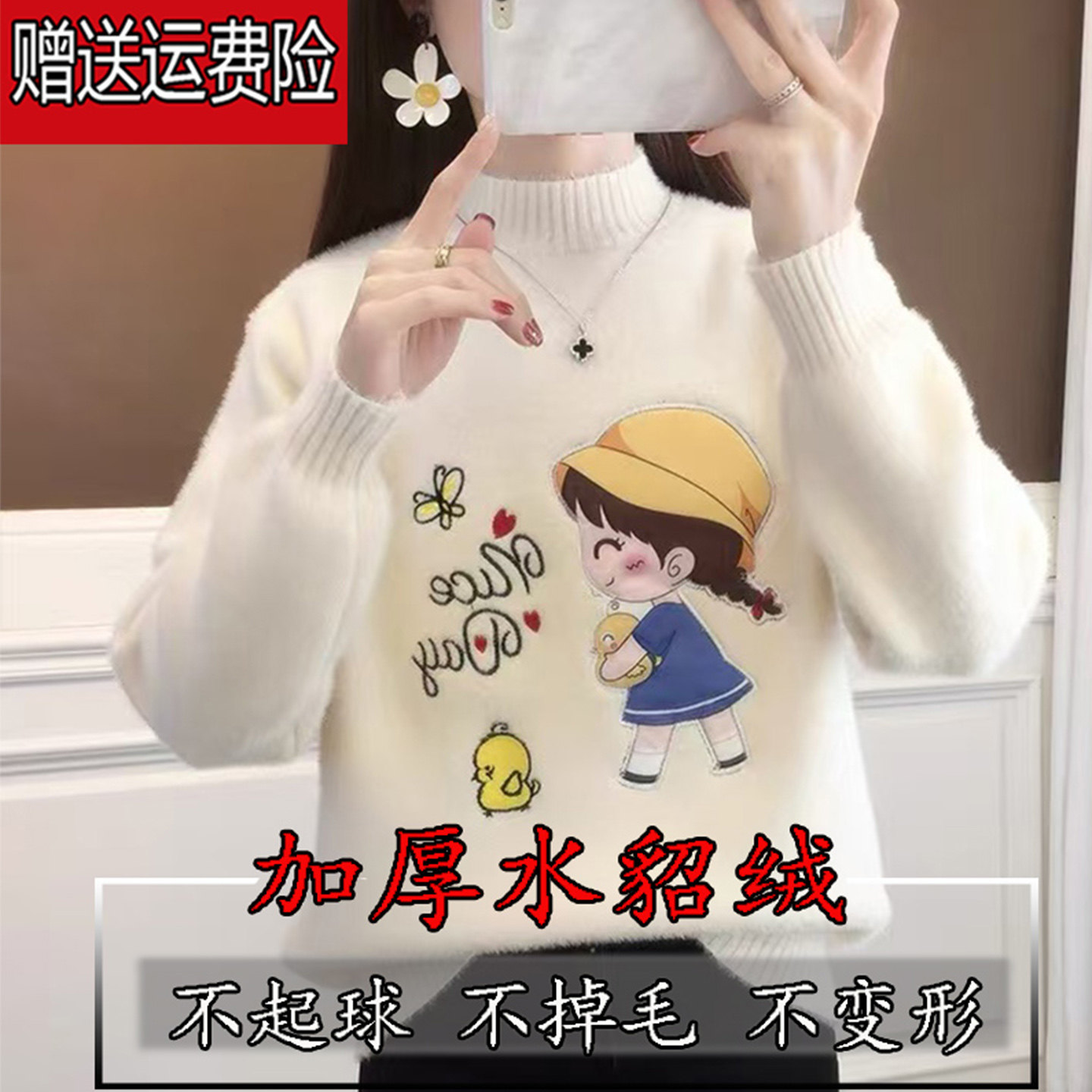 • 半高领水貂绒毛衣女秋冬季新款学生卡通刺绣时尚针织打底衫一体绒