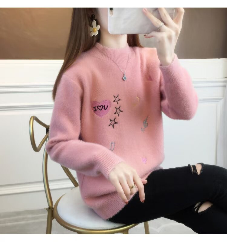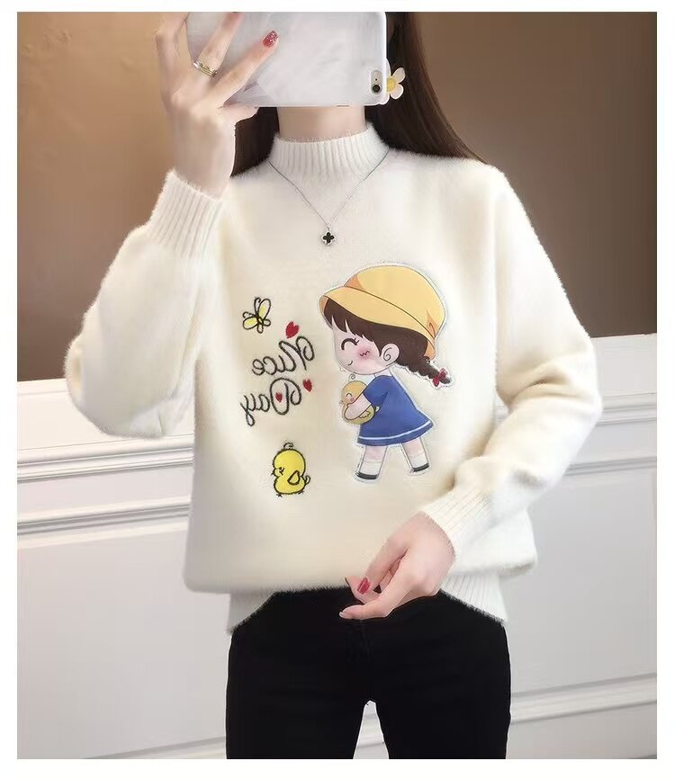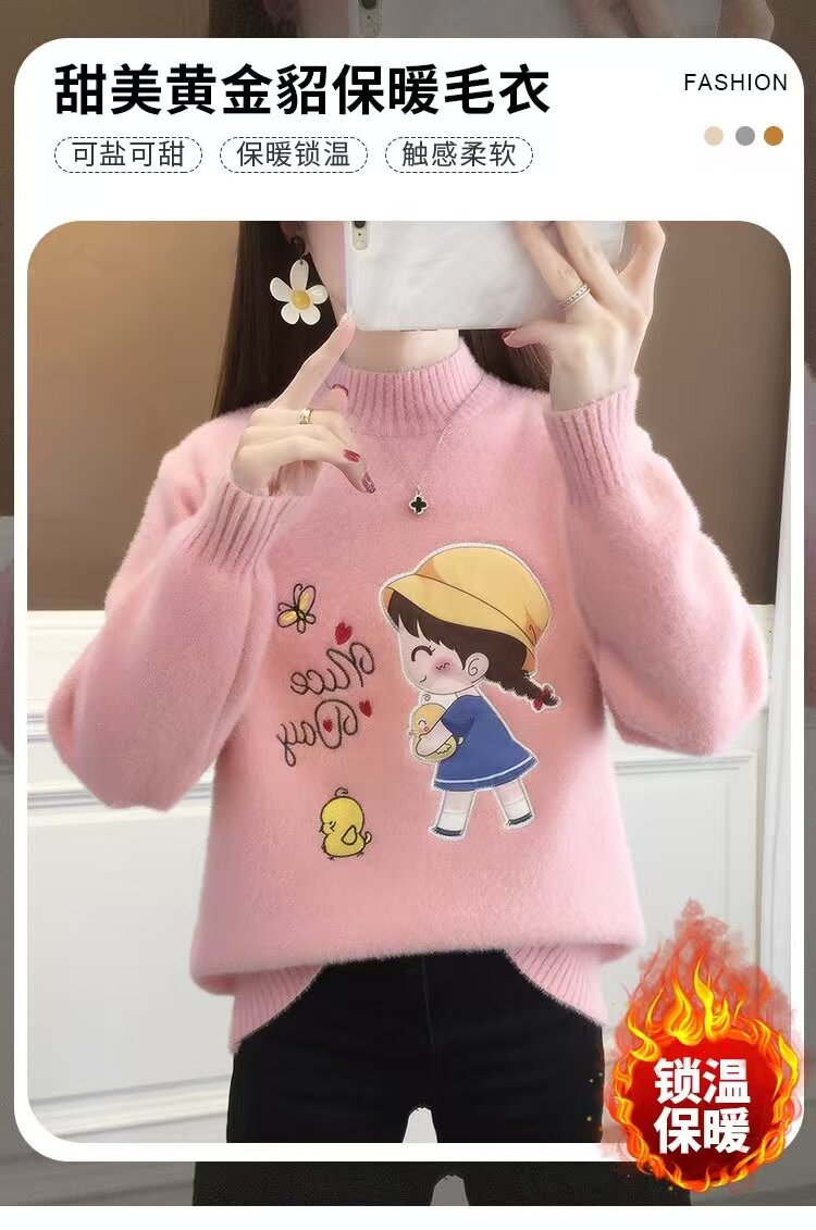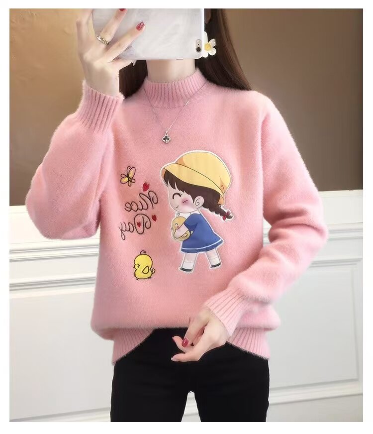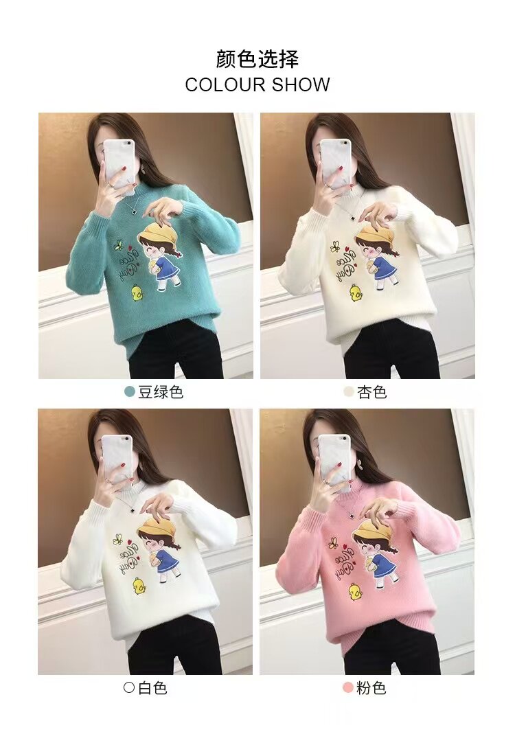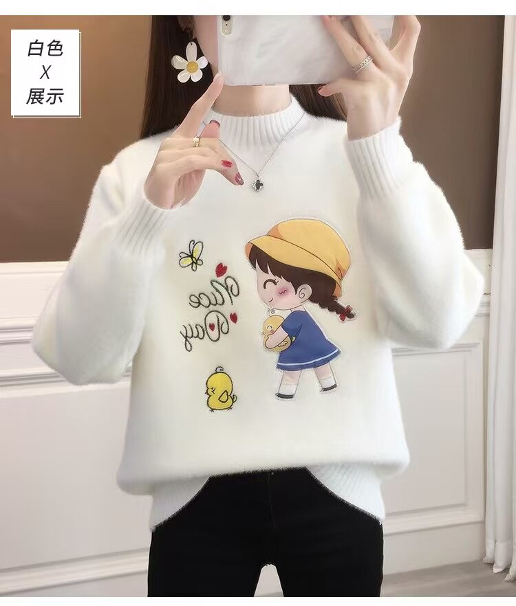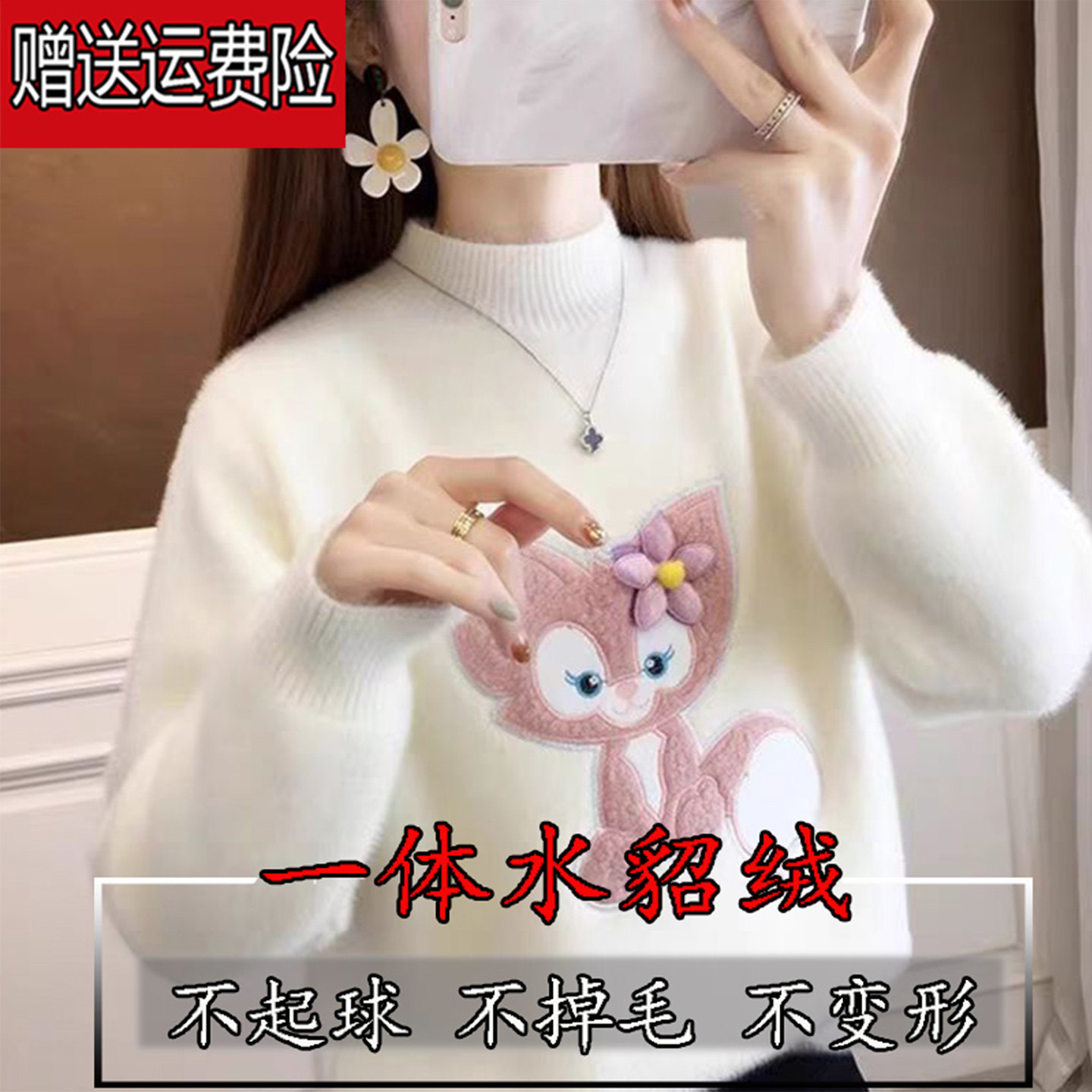 • 半高领水貂绒毛衣女秋冬季新款学生卡通刺绣时尚针织打底衫一体绒