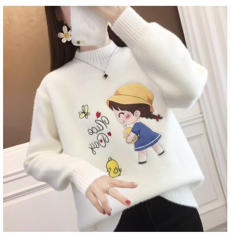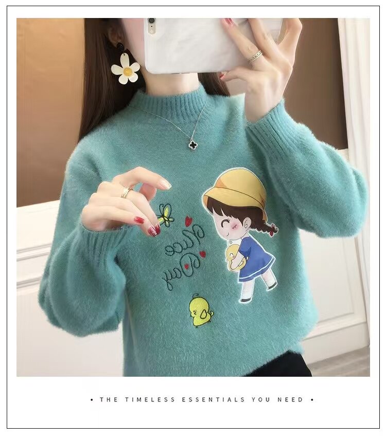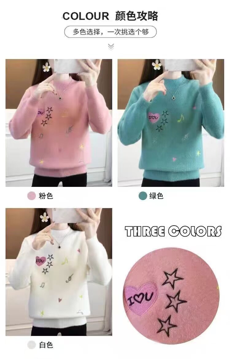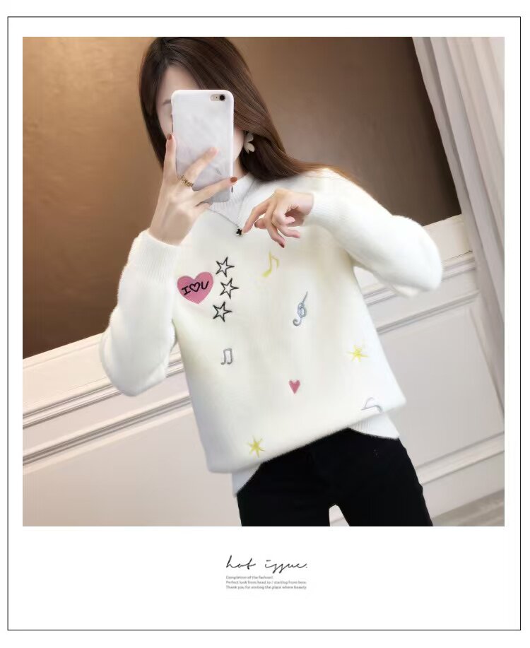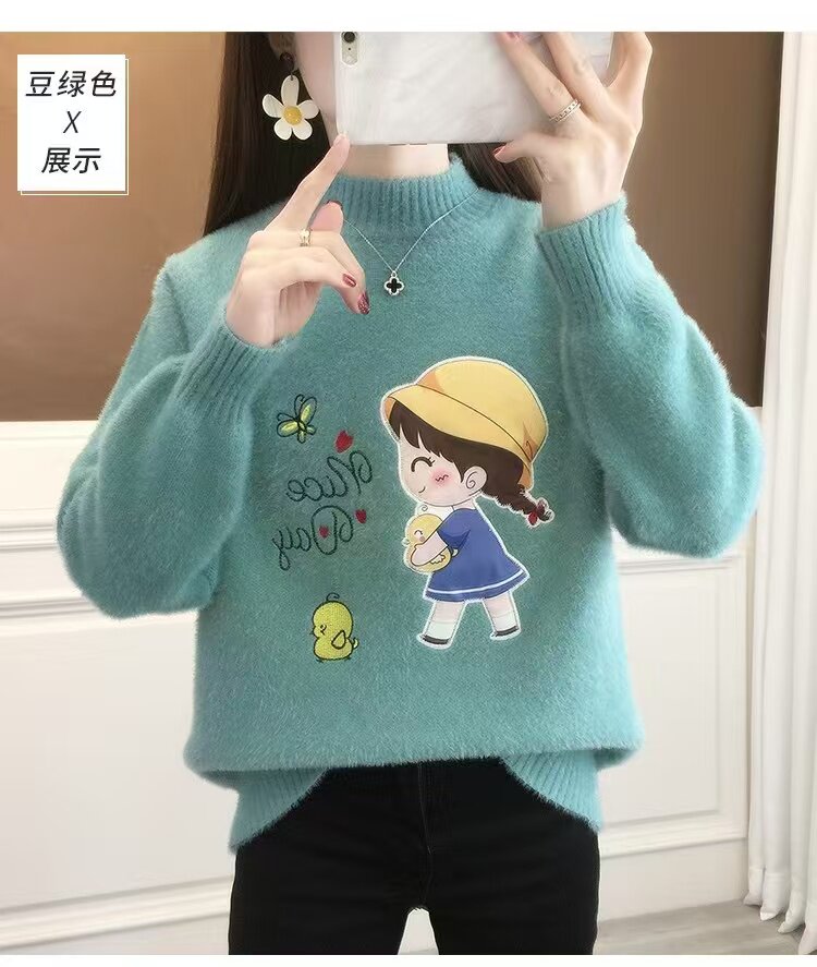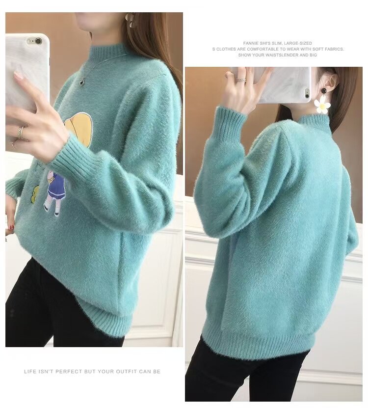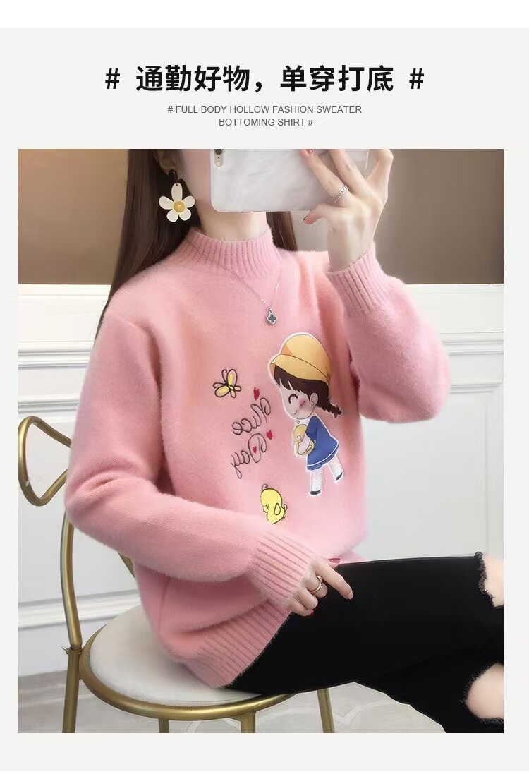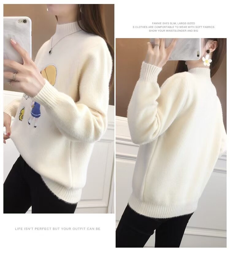 • 半高领水貂绒毛衣女秋冬季新款学生卡通刺绣时尚针织打底衫一体绒