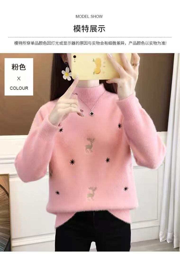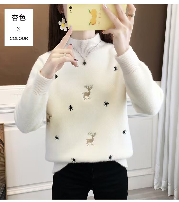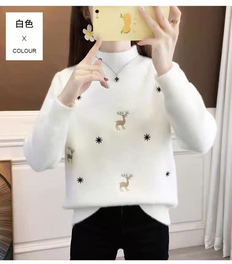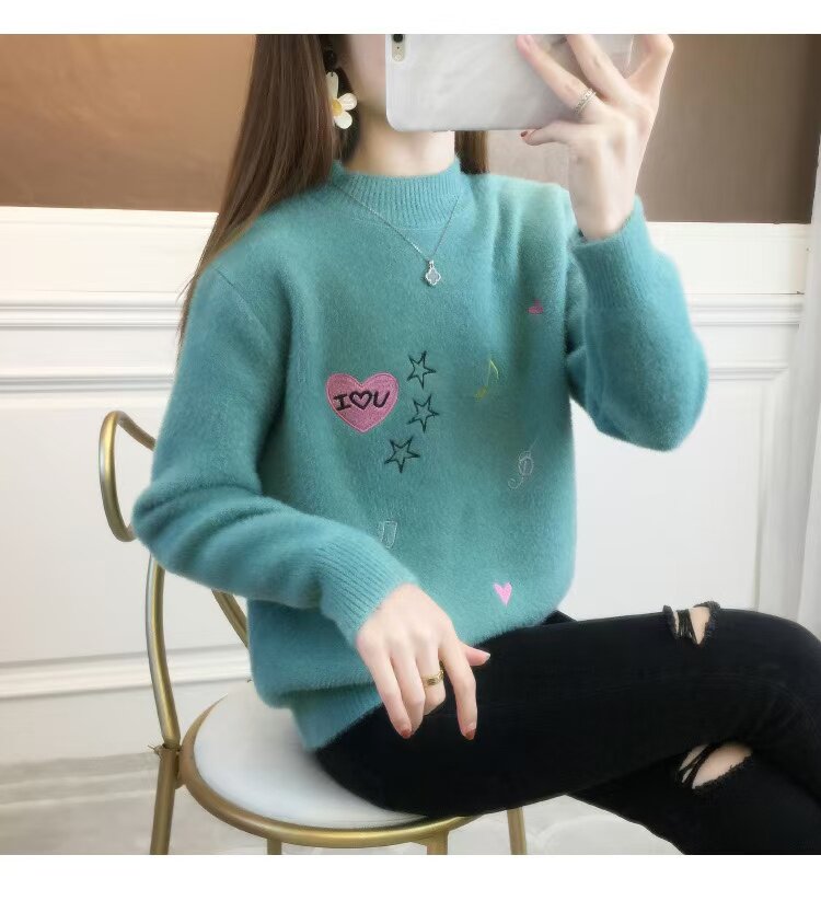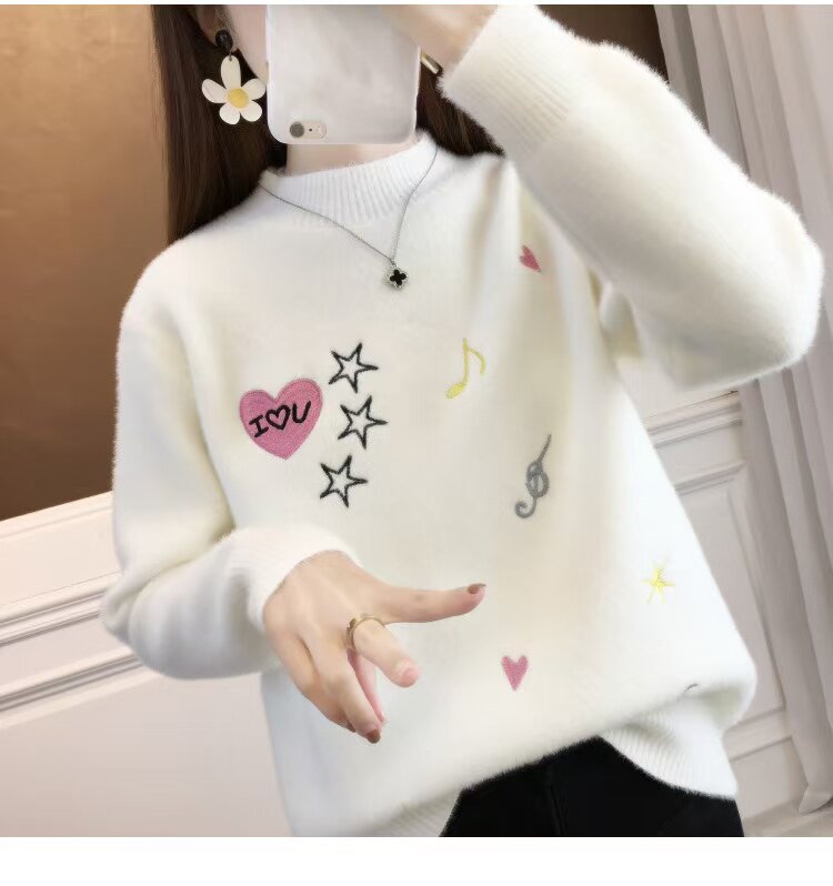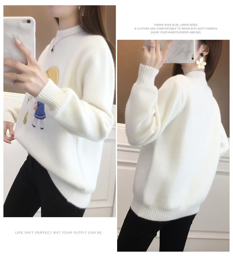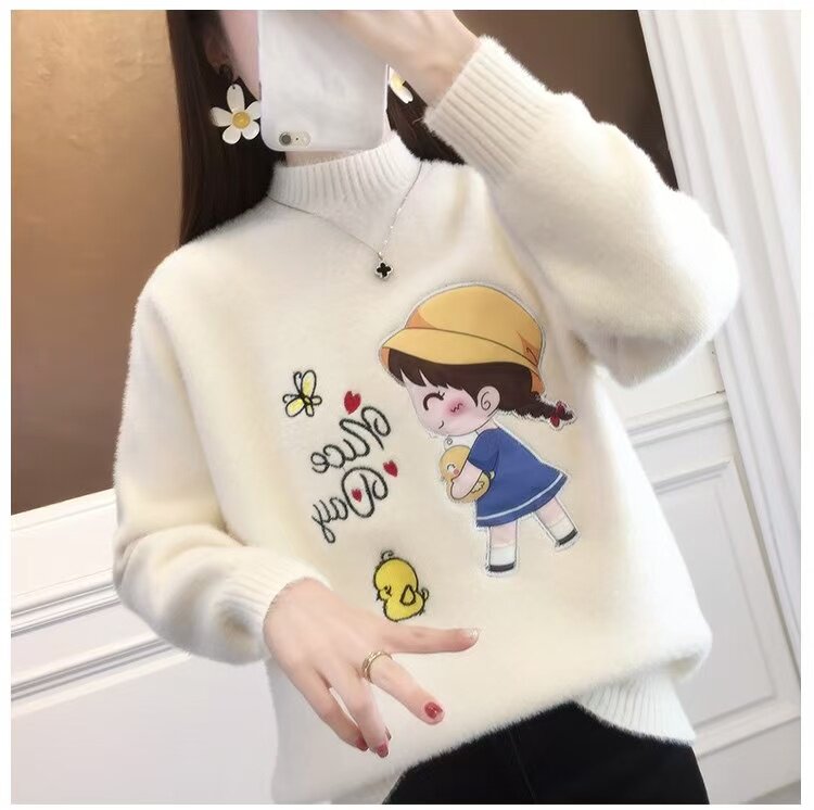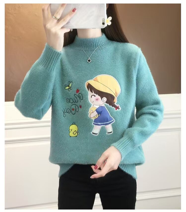 • 半高领水貂绒毛衣女秋冬季新款学生卡通刺绣时尚针织打底衫一体绒