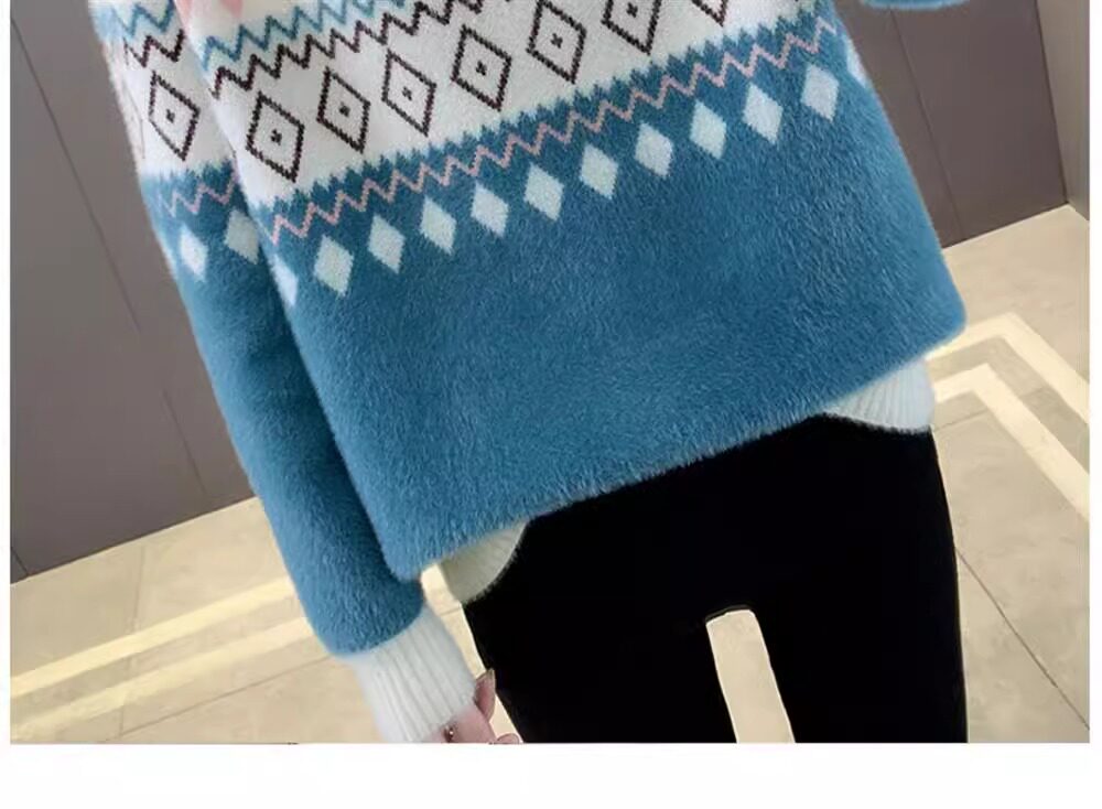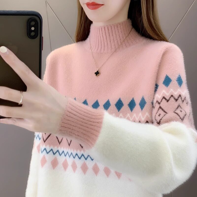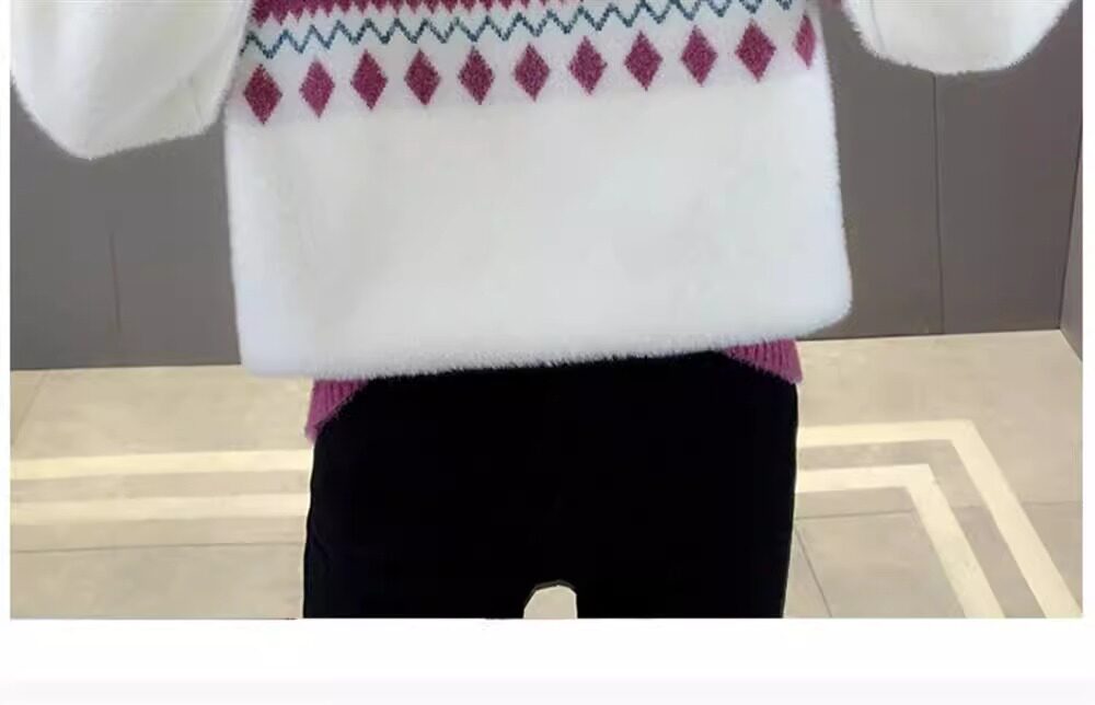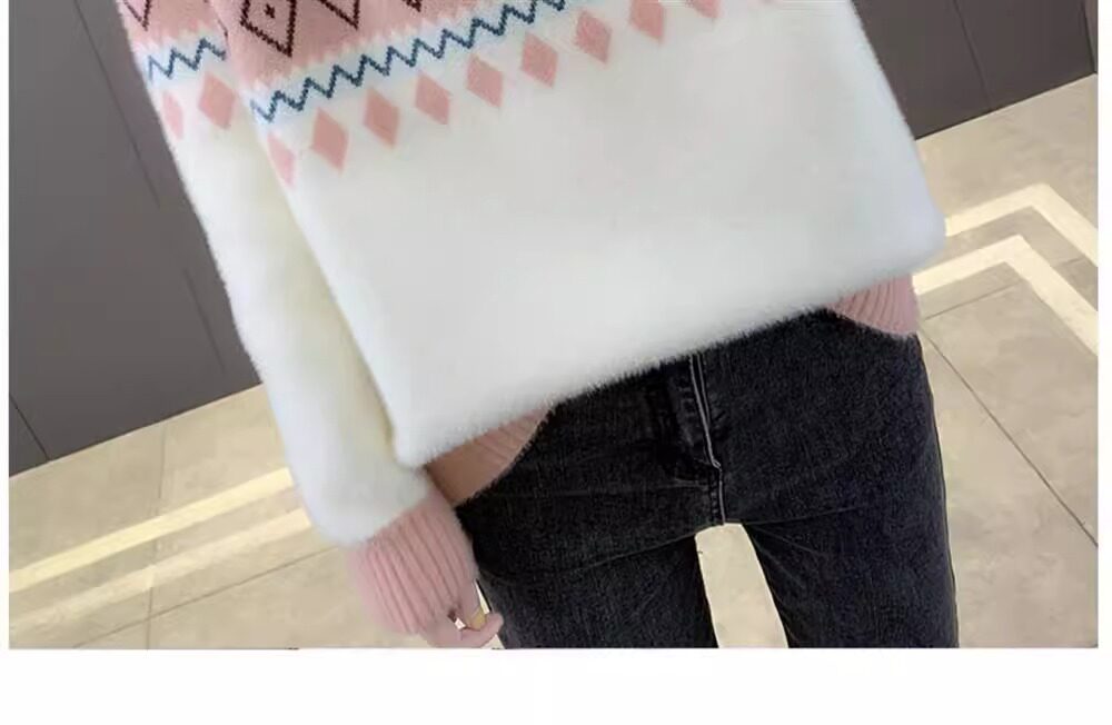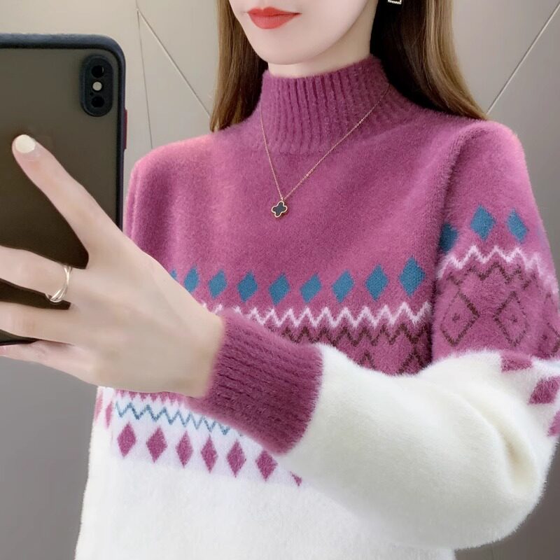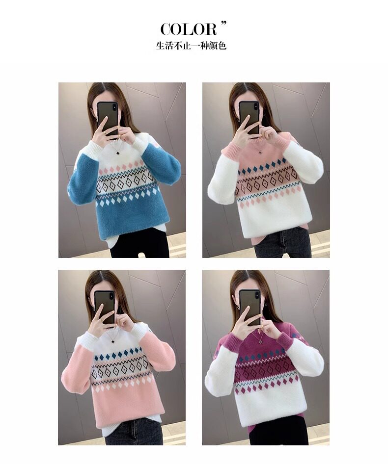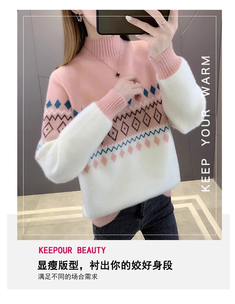 • 洋气条纹毛衣女秋冬新款拼色水貂绒上衣短款半高领针织打底衫长袖