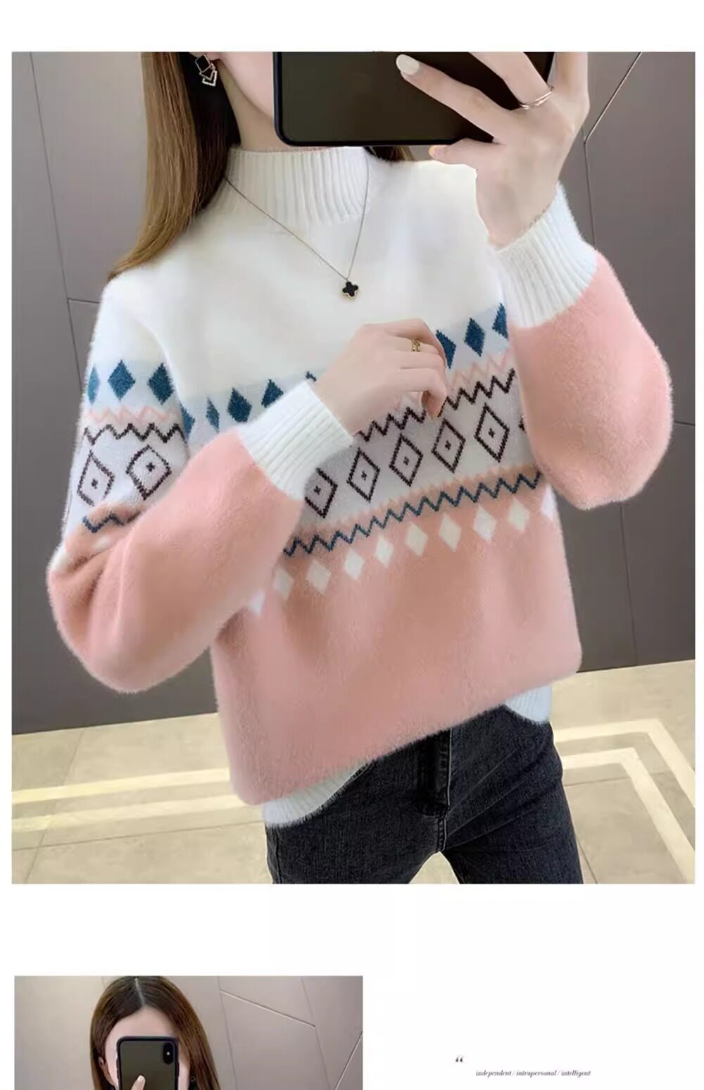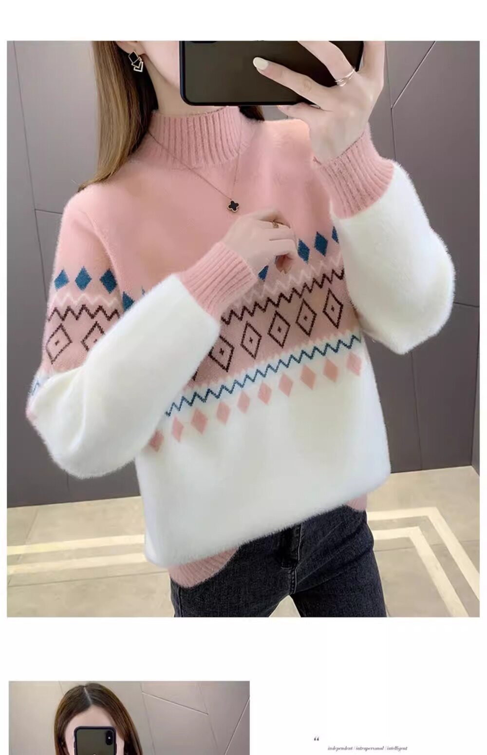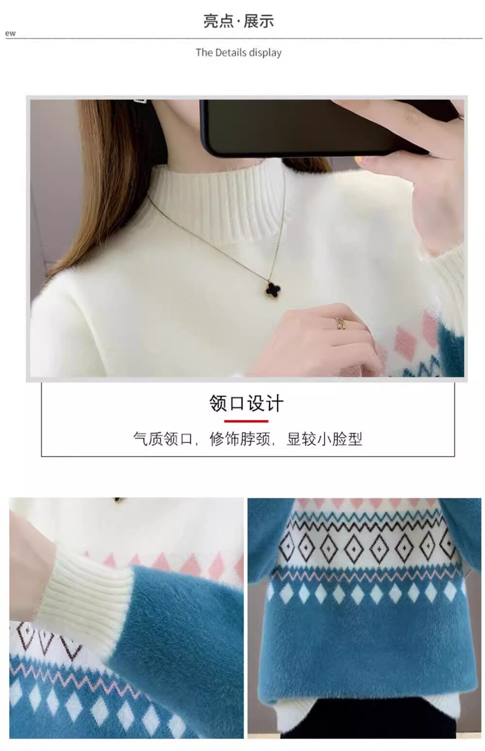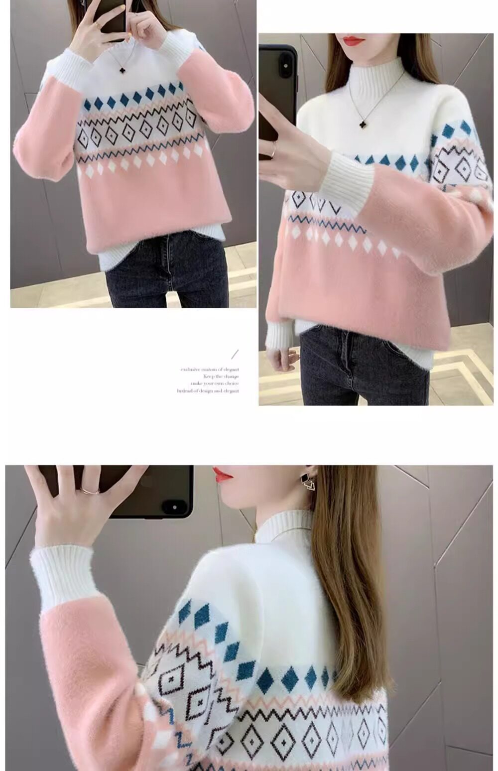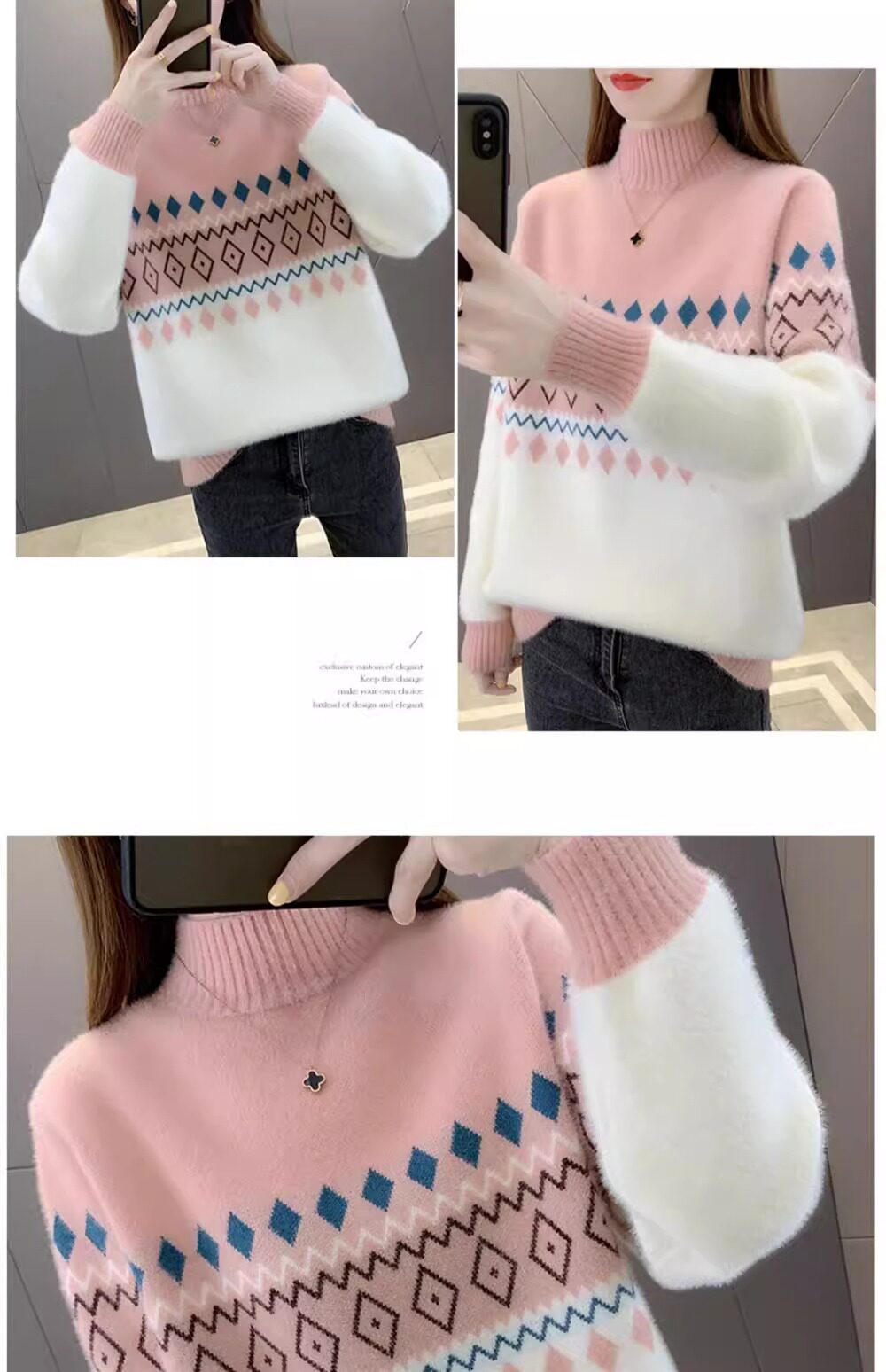 • 洋气条纹毛衣女秋冬新款拼色水貂绒上衣短款半高领针织打底衫长袖