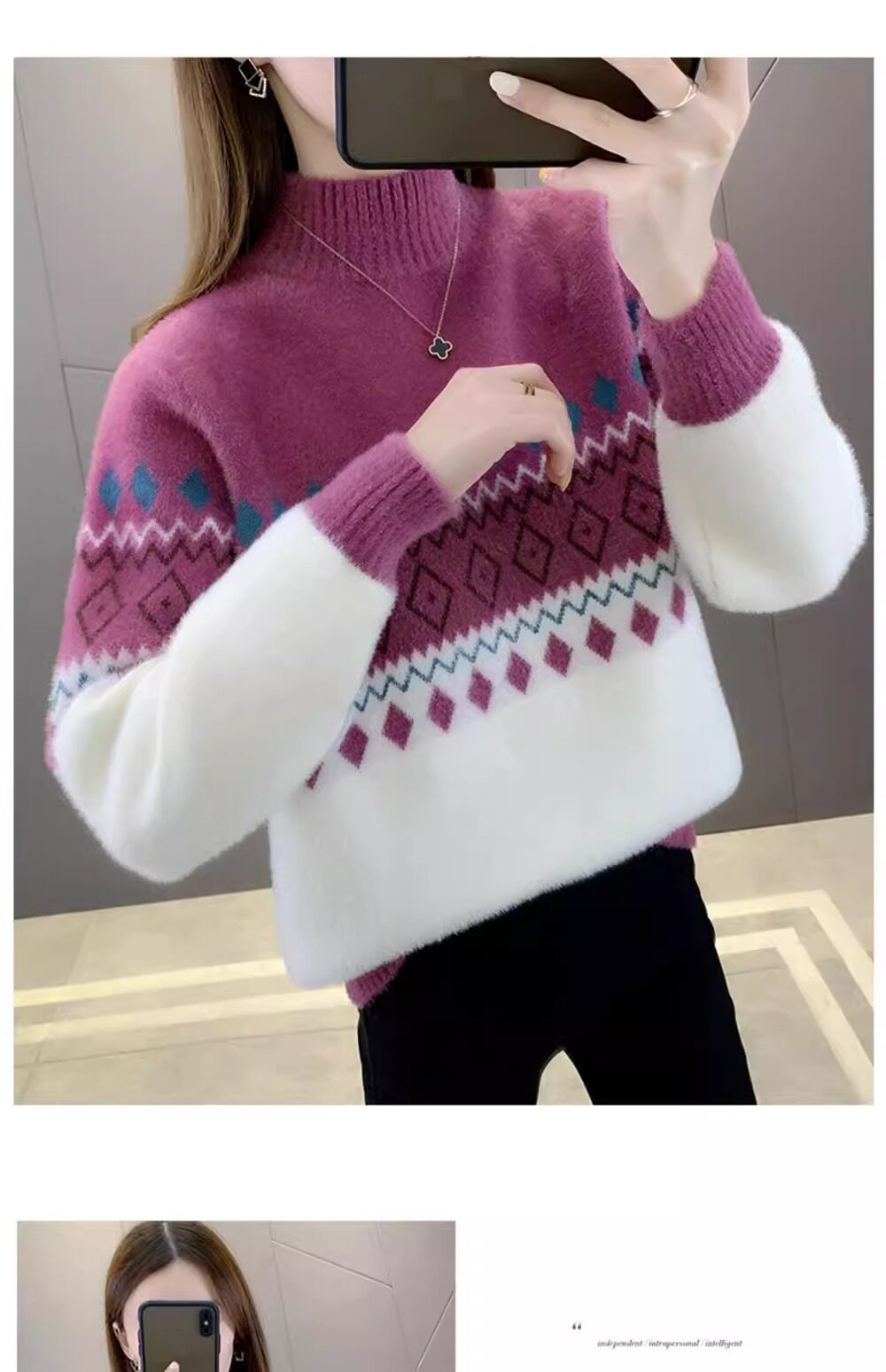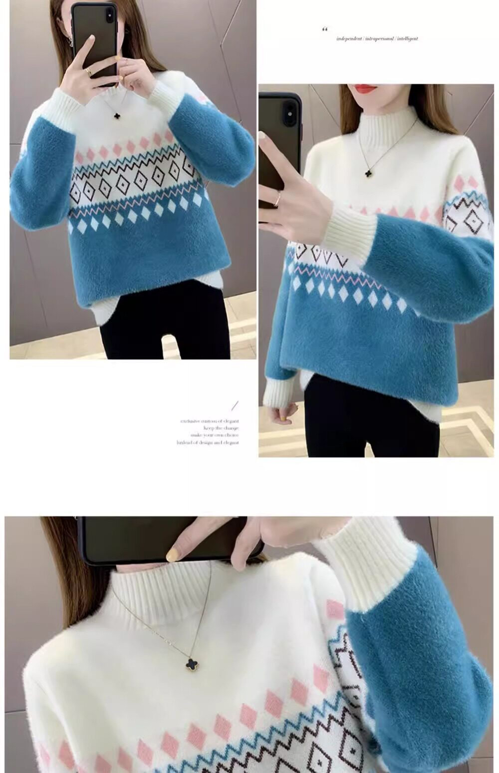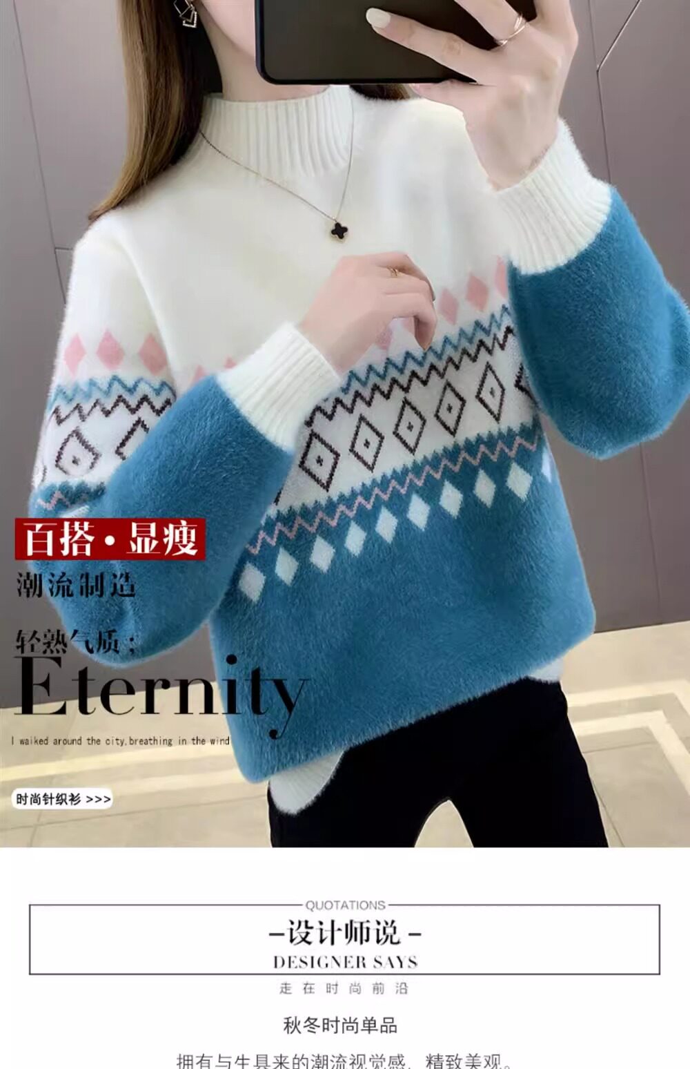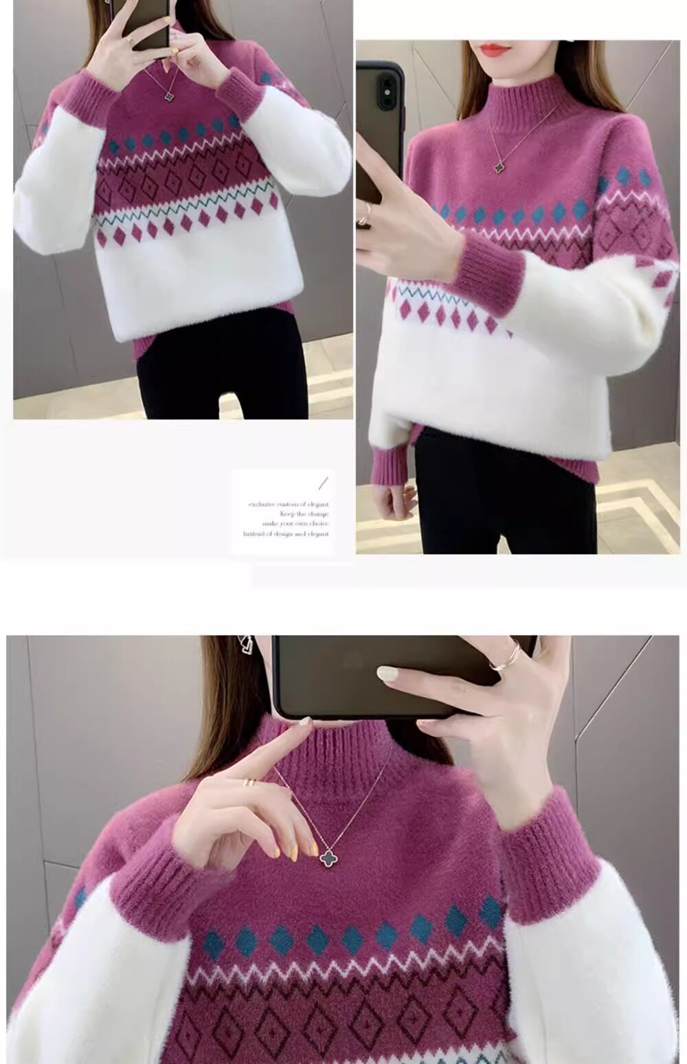 • 洋气条纹毛衣女秋冬新款拼色水貂绒上衣短款半高领针织打底衫长袖